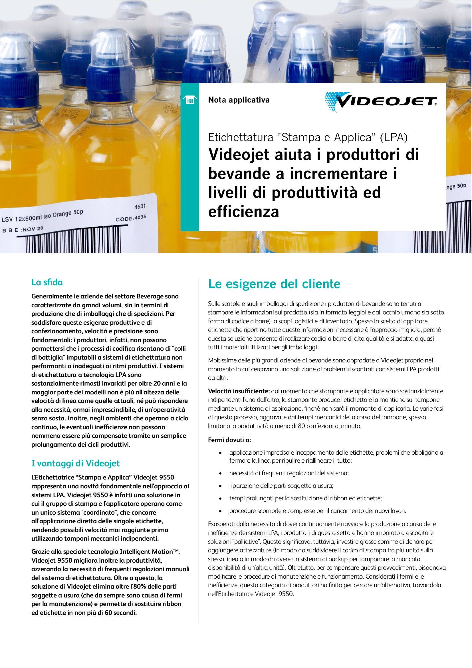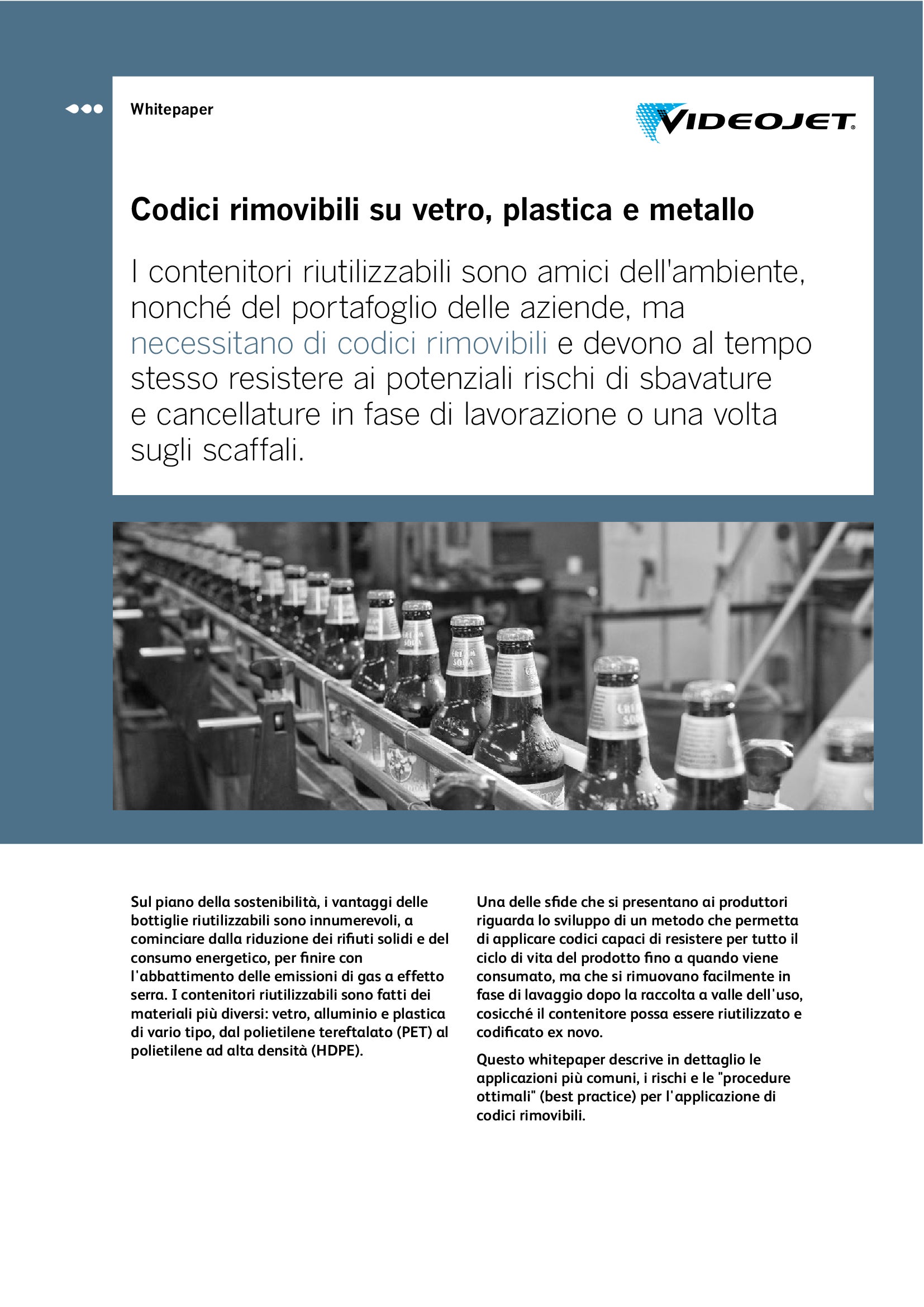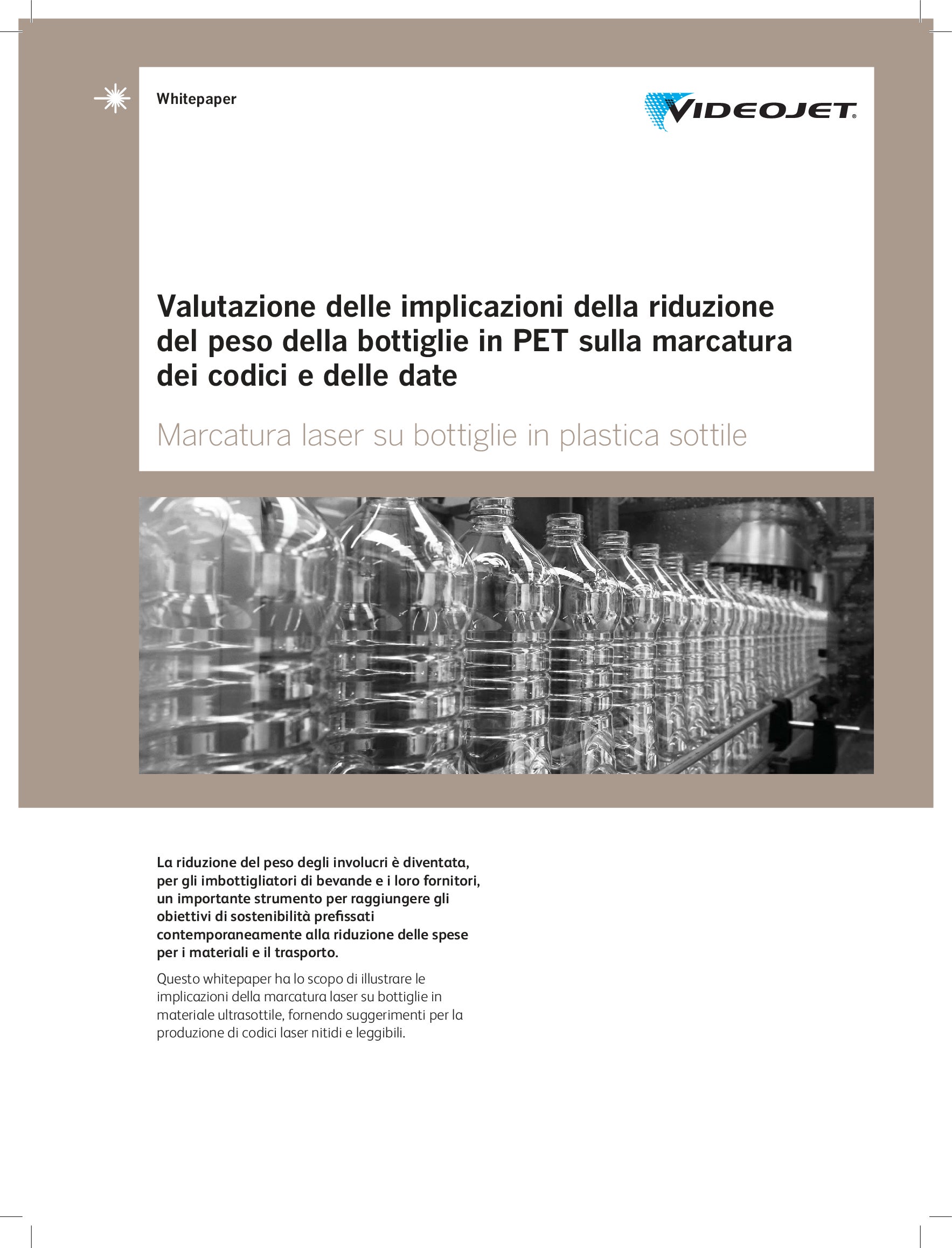 La forma, le dimensioni e la composizione delle bottiglie di plastica, trasparenti o colorate che siano, si trasformano di continuo. I codici stampati su questi contenitori includono in genere informazioni utili per il consumatore, come la data di scadenza, oppure i dati di produzione necessari per la gestione della Supply Chain.