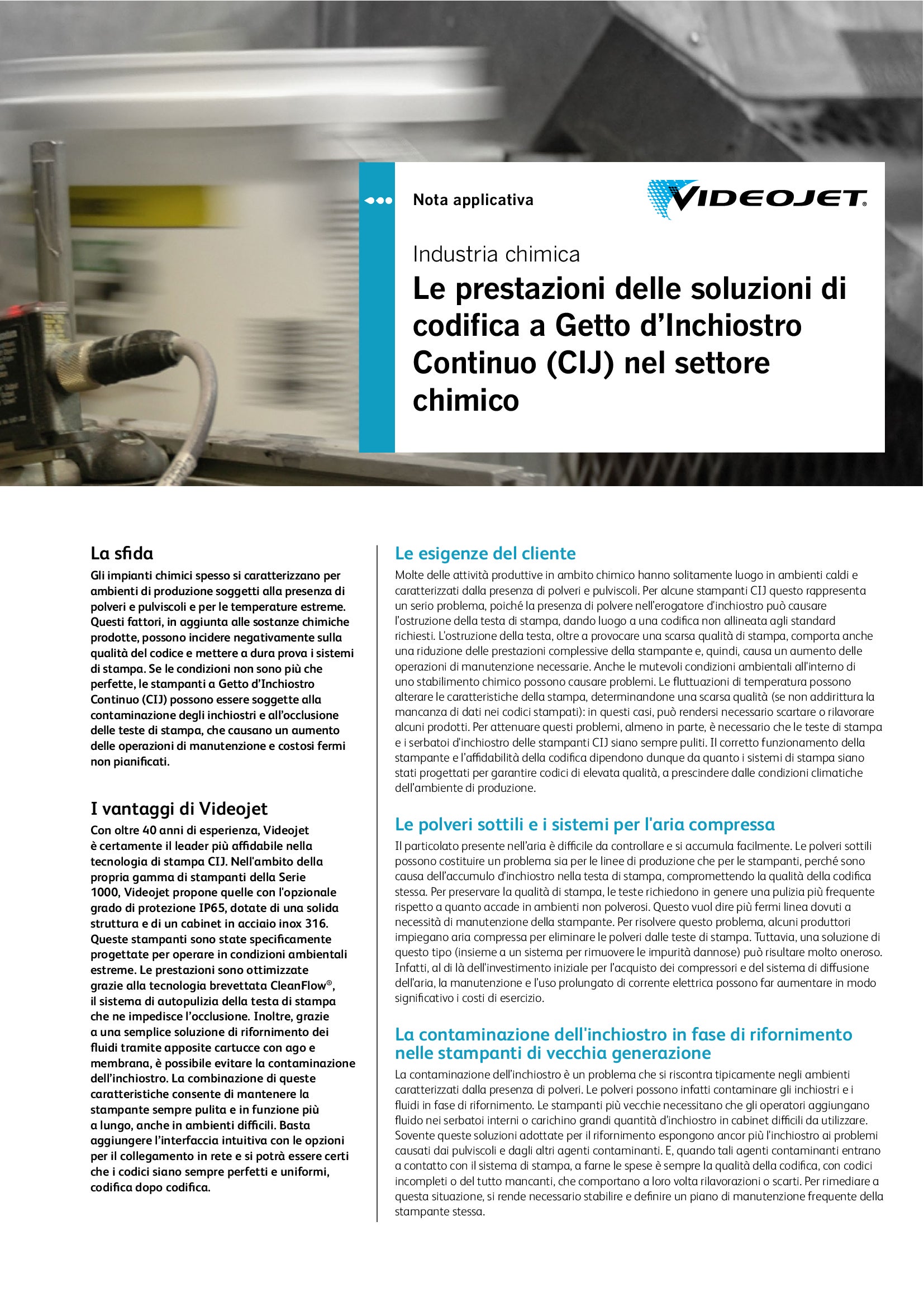Le attività di codifica negli stabilimenti chimici possono risultare complesse, poiché spesso vengono effettuate in ambienti difficili e caratterizzati da alte temperature o dalla presenza di umidità e di polveri. Per assicurare codici affidabili e di elevata qualità, i sistemi di codifica devono essere progettati per risultare all’altezza di queste sfide. Non solo: devono anche saper rispondere al meglio alle necessità di una produzione a ciclo continuo, che prevede per giunta cambi e sostituzioni frequenti. Che si tratti di esigenze sul piano della qualità interna o di requisiti di tracciabilità, Videojet ha tutto quello che serve per supportare al meglio i propri clienti.