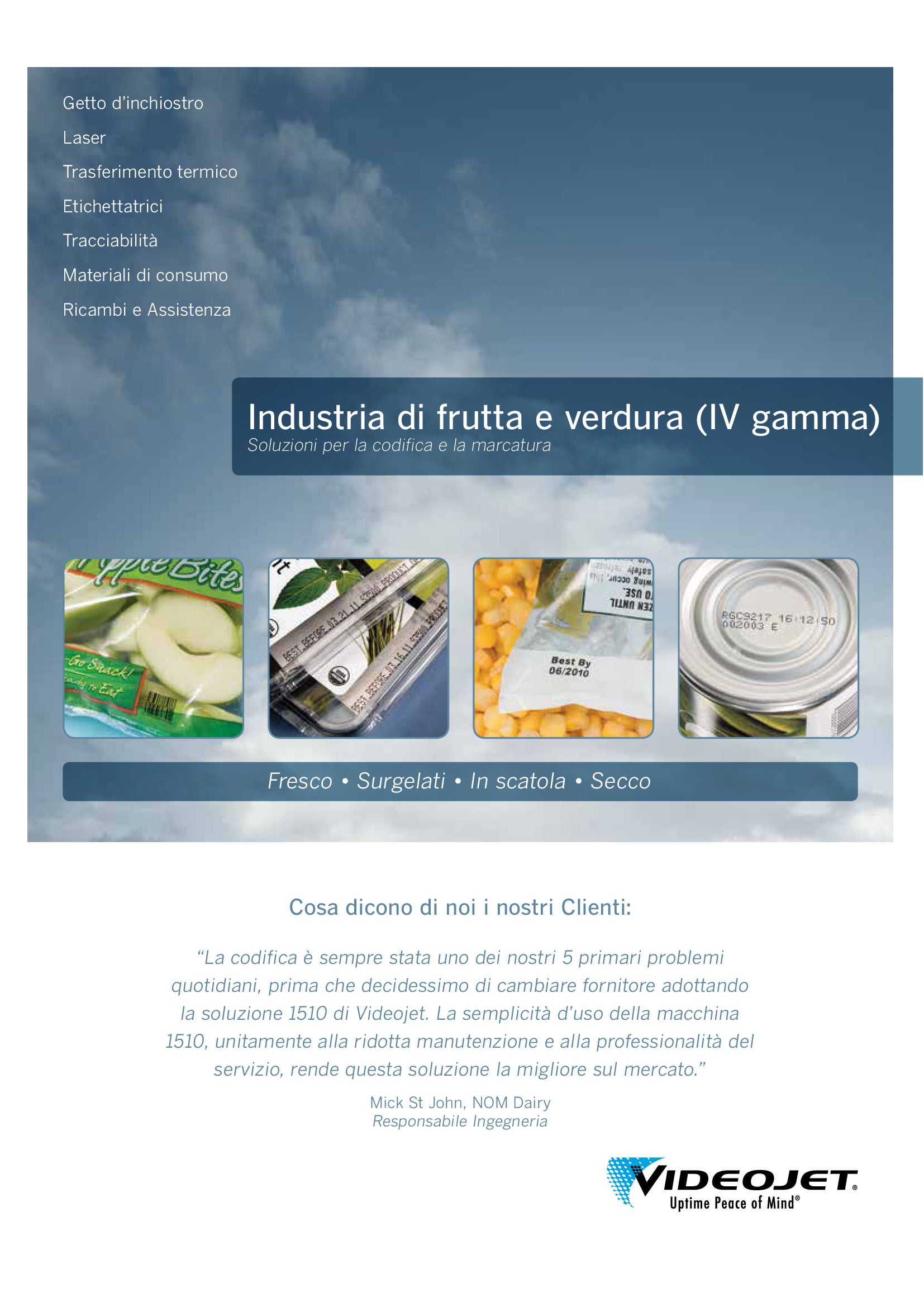 Gli impianti di confezionamento dei prodotti della IV gamma sono tra gli ambienti di produzione più difficili a causa delle variazioni di temperatura, eccessiva umidità e presenza di polvere. I produttori di questo settore vogliono affidarsi a fornitori di sistemi di codifica e marcatura in grado di comprendere tali problematiche e di fornire soluzioni per un’ampia varietà di imballaggi di formato diverso. Grazie al suo vasto assortimento di tecnologie, Videojet è in grado di risolvere queste sfide con soluzioni appropriate e a elevata produttività.