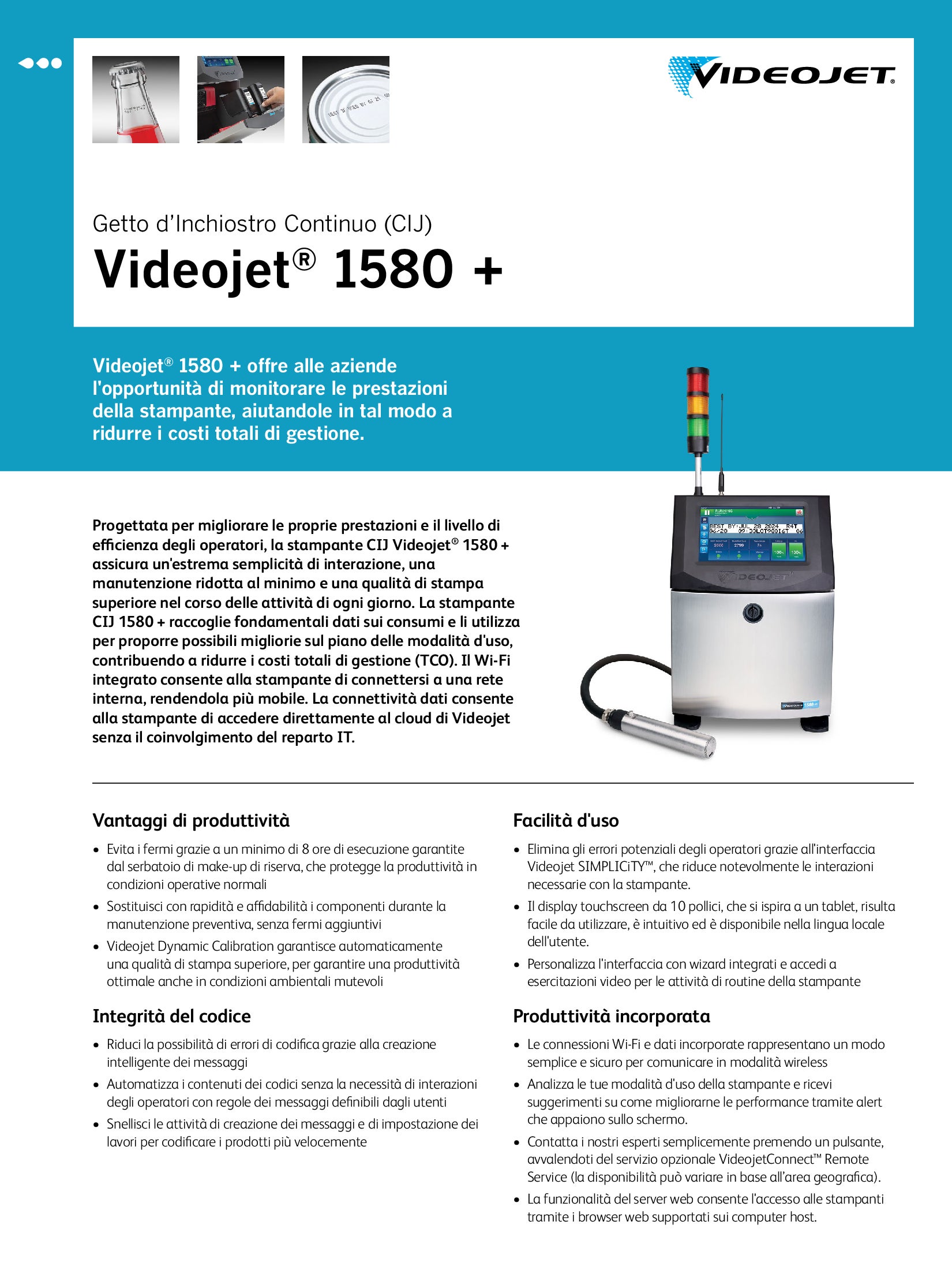 • La stampante a Getto d’Inchiostro Continuo (CIJ) Videojet 1580 + valuta i modelli di consumo della singola stampante e fornisce indicazioni per garantire operazioni a prova di errore.