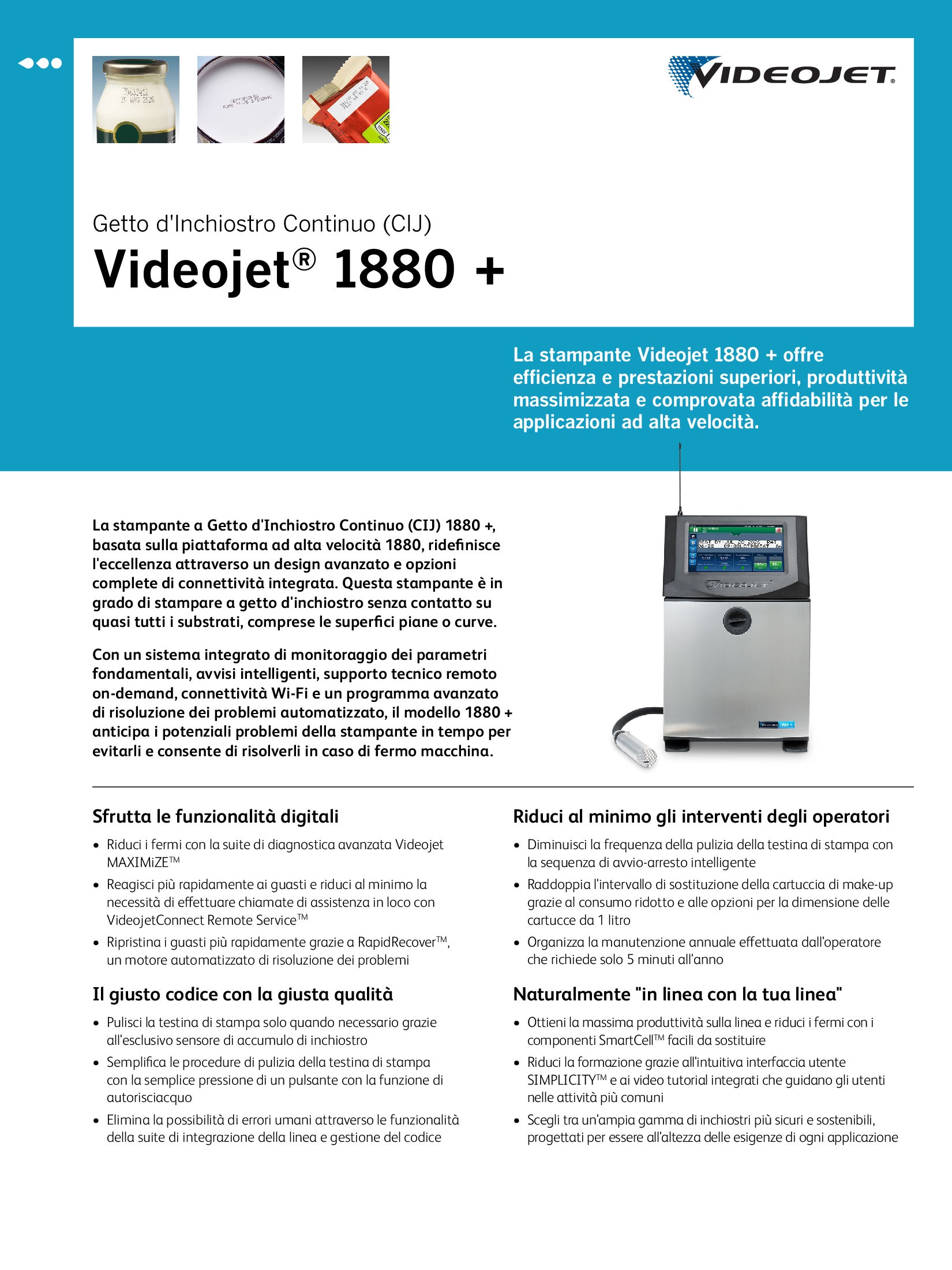 - Videojet 1880 + consente operazioni plant intelligenti e analisi proattive, come il monitoraggio dei segni vitali, allarmi smart, supporto da remoto e risoluzione dei problemi avanzata.