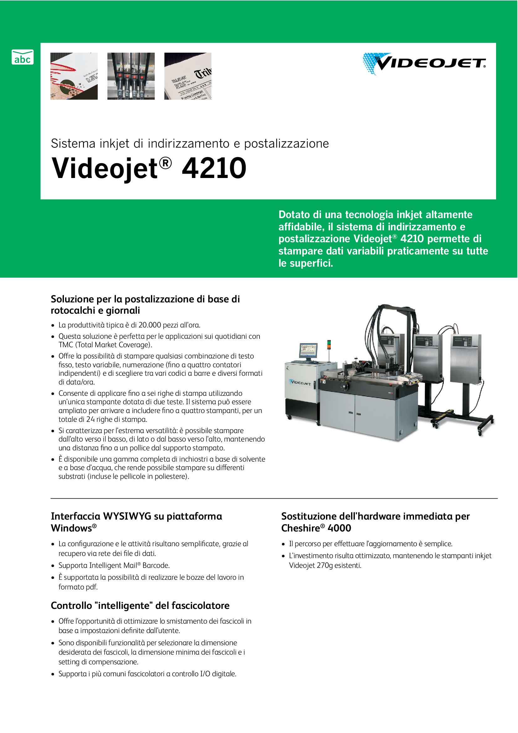 Dotato di tecnologia a getto d’inchiostro altamente affidabile, il sistema di indirizzamento Videojet 4210 permette di stampare dati variabili su praticamente tutte le superfici.