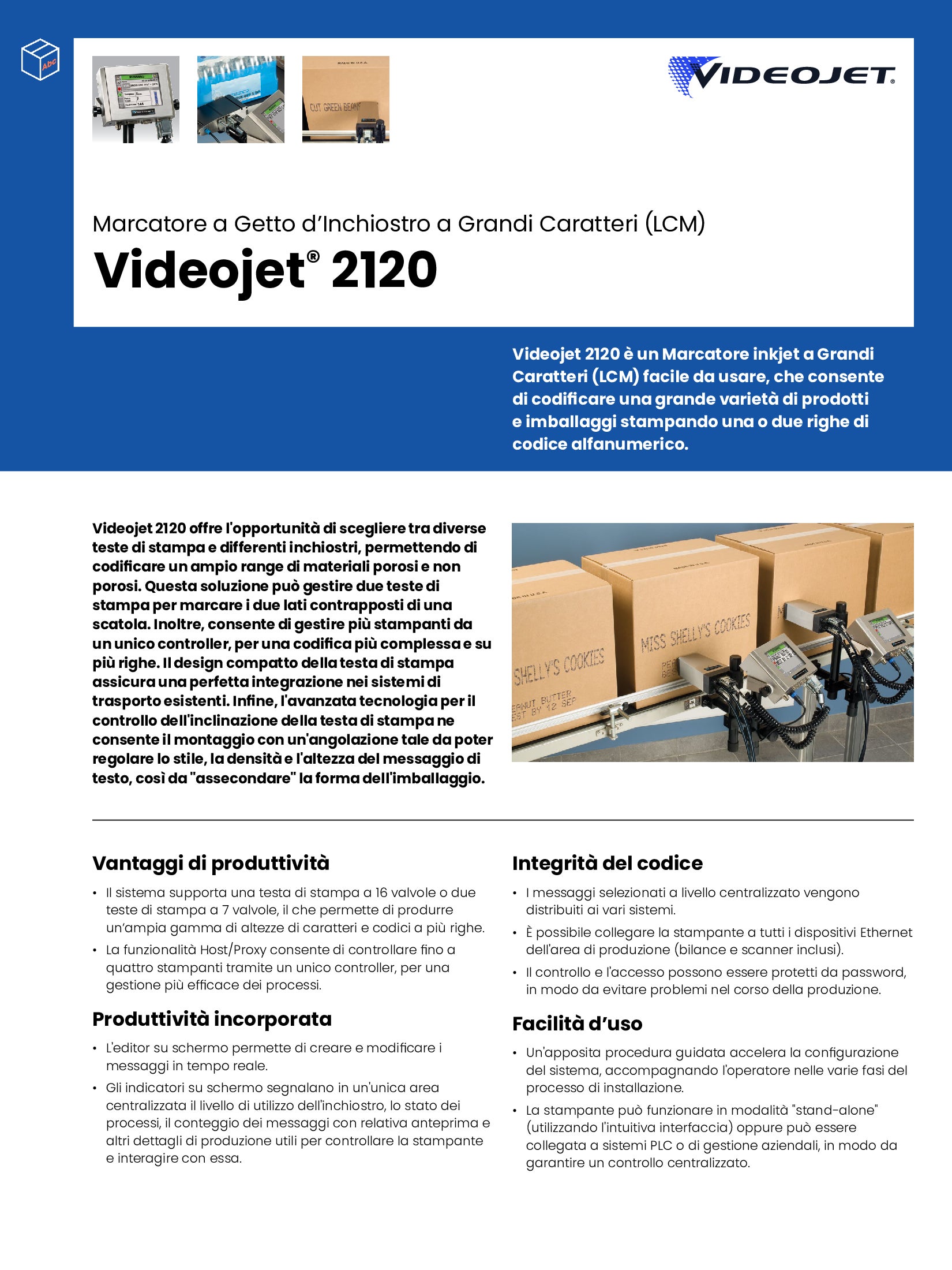 La stampante Videojet 2120 consente di applicare con estrema facilità codici alfanumerici a una o due righe su tutta una serie di prodotti e imballaggi. Grazie a un’intera gamma di teste di stampa e inchiostri, questo modello può stampare su un’ampia varietà di materiali porosi e non. Accanto al controllo di due teste di stampa per la codifica sui lati opposti delle confezioni, il modello 2120 permette di controllare più stampanti da un’unica schermata per le operazioni di codifica multiriga più complesse.