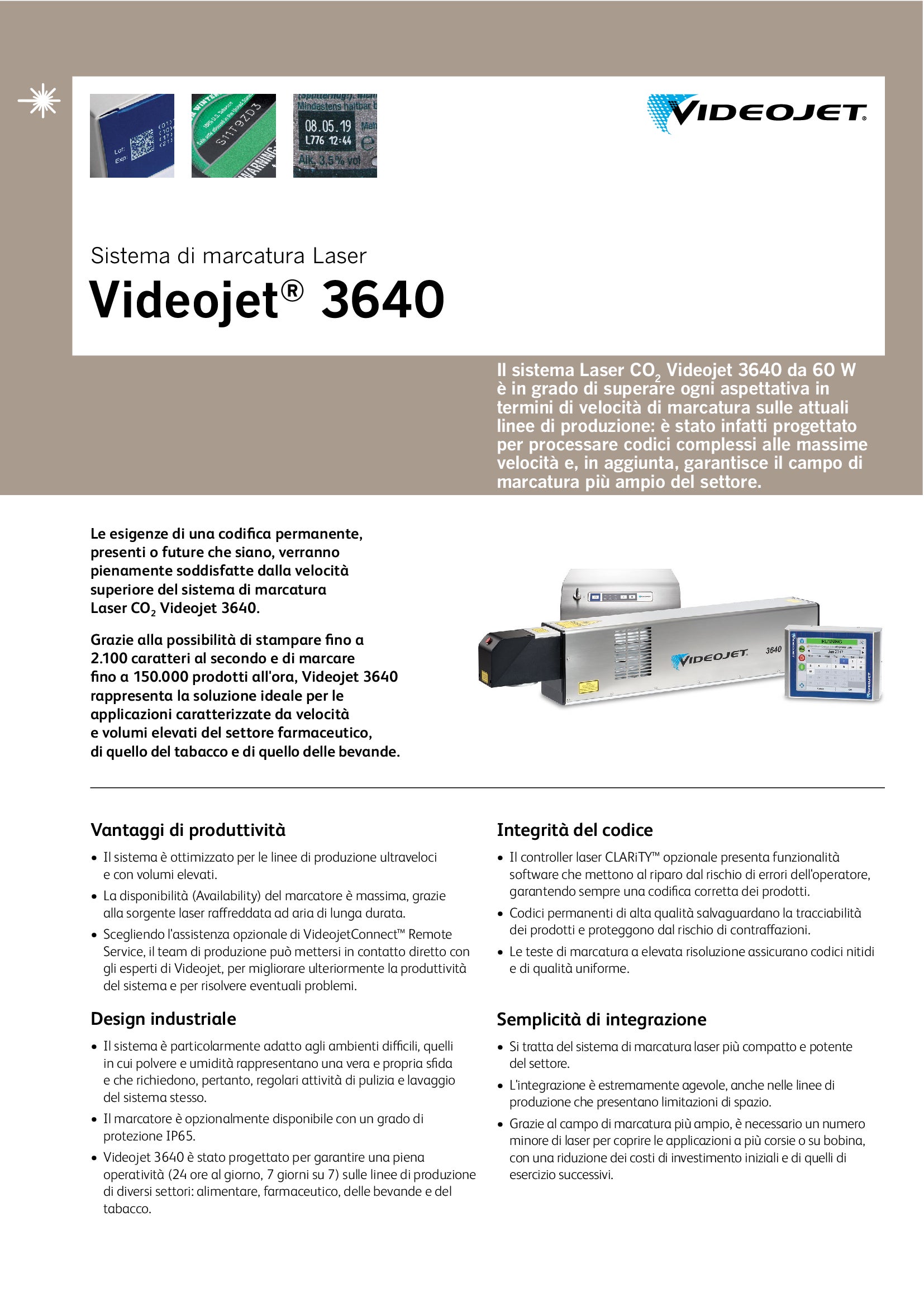 - Videojet 3640 è stato progettato per garantire una piena operatività (24 ore al giorno, 7 giorni su 7) sulle linee di produzione di diversi settori: alimentare, farmaceutico, delle bevande e del tabacco.