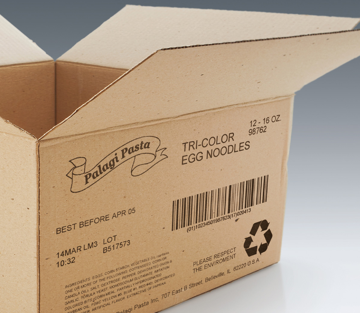 Impiegati soprattutto per imballaggi secondari e terziari, gli imballi di cartone consentono una codifica versatile di testi, codici e simboli per l’identificazione e la logistica.