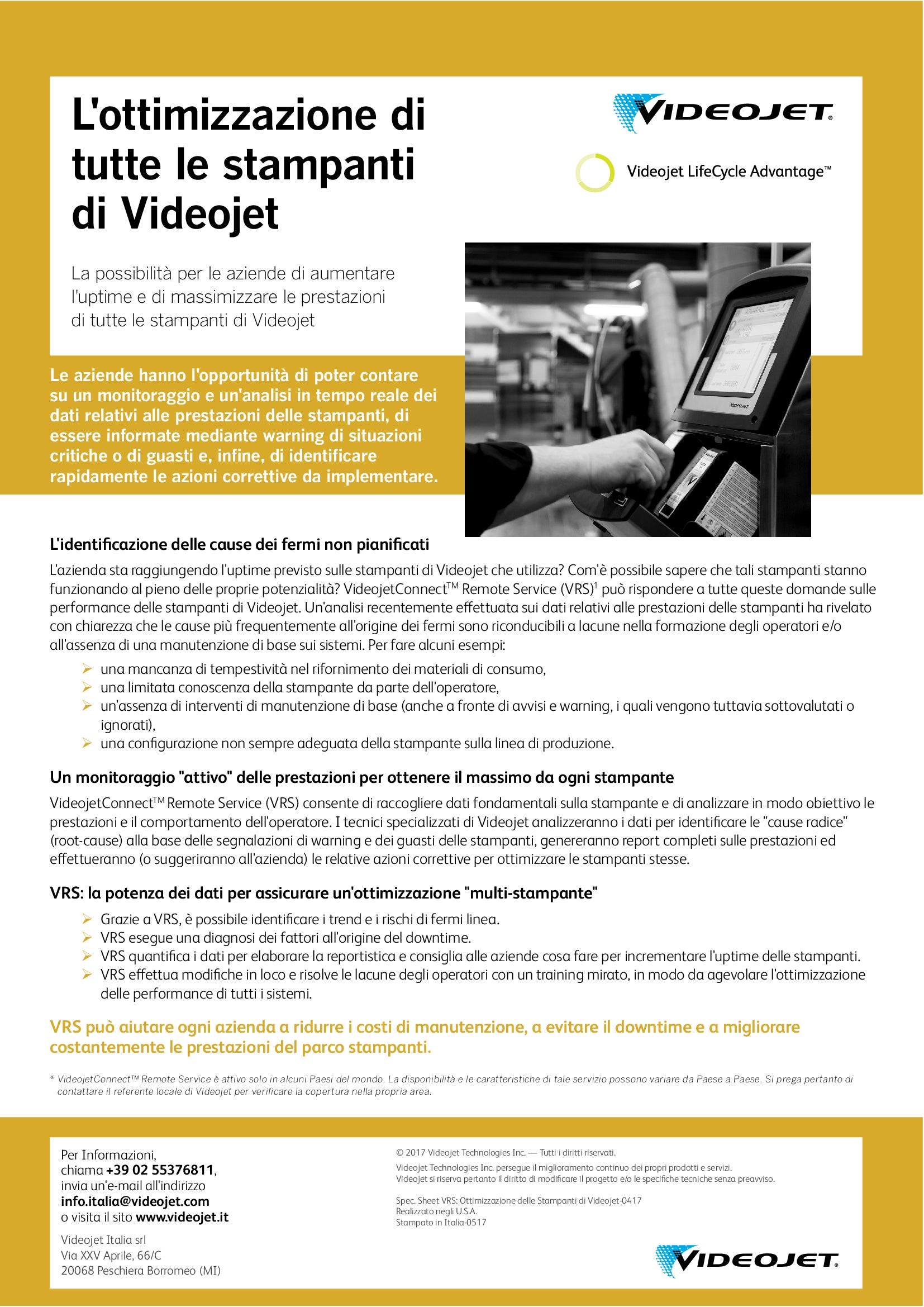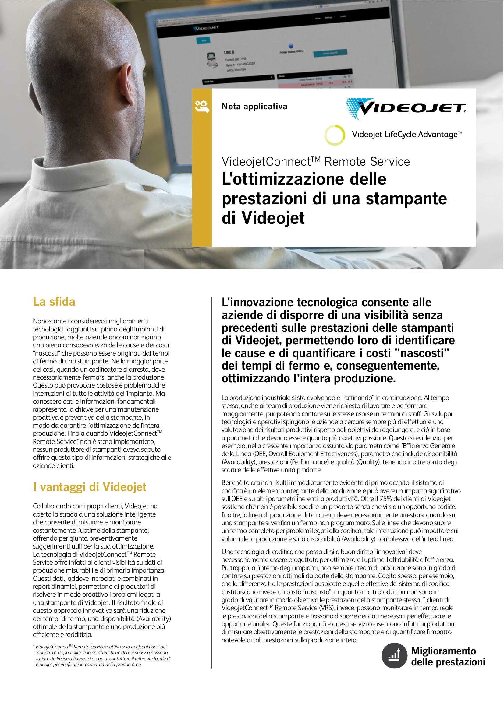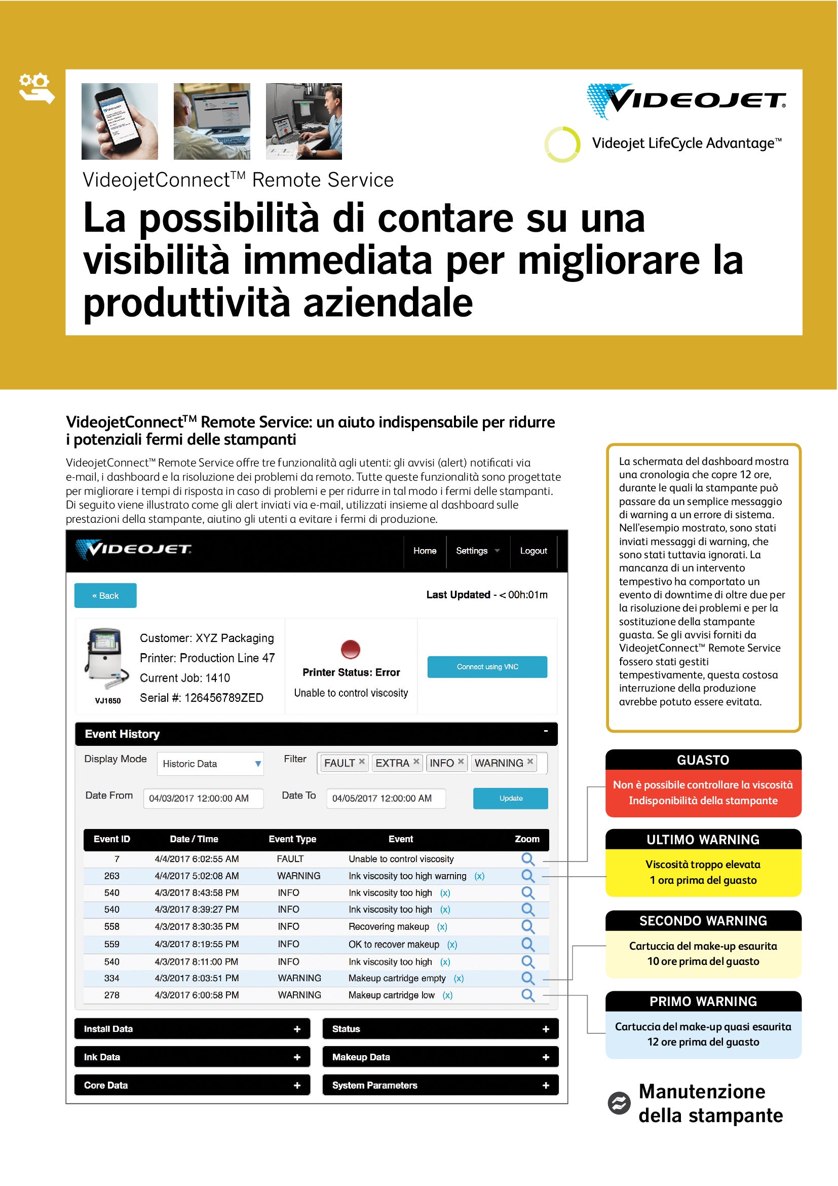 Ora l’azienda può verificare lo stato di tutte le stampanti Videojet nell’impianto e analizzare le informazioni dettagliate della singole unità, consentendo agli operatori di rispondere in modo proattivo. I valori di configurazione possono essere visualizzati rapidamente grazie alla navigazione semplificata, mentre i grafici tengono traccia della cronologia di una singola unità e aiutano a identificare le cause del fermo.